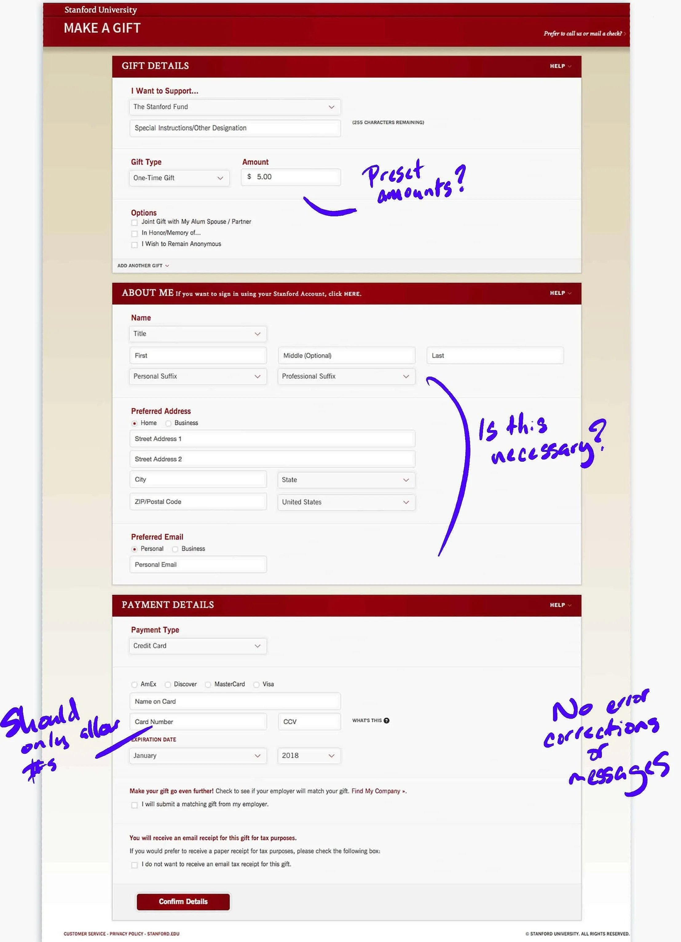 We cleaned up some of the heuristic issues on the giving form as well and pushed all of the extraneous data that the university wanted to collect towards the end of the workflow. We also suggested that the university add the convenience of a quick pay option, as it was mentioned several times in testing sessions.
